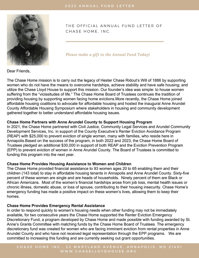 For more than 130 years, the Chase-Lloyd House had sheltered women who suffered "the vicissitudes of life." No longer able to house women, our mission is to carry ou the legacy of Hester Chase Ridout's Will of 1886 by supporting women who do not have the means to overcome hardships, achieve stability and have safe housing. Your donations will enable the Chase Home to fund programs to support women facing housing insecurity.
